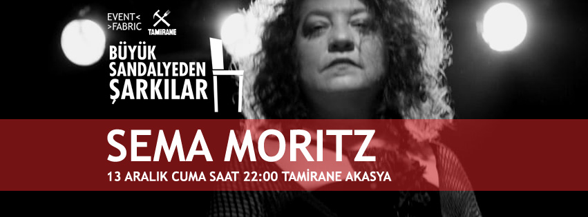 Büyük Sandalyeden Şarkılar, aralık ayında sanatı, kişiliği ve yorumculuğuyla birçoğumuzun kalbine dokunan çok değerli bir santçıyı gecesine konuk ediyor: Sema Moritz. 1980 yılında Ankara Dil Tarih ve Cografya Fakültesi’nden mezun olan Ankara doğumlu sanatçı kariyerinde önemli bir şehir olan Berlin’e gider. Klasik Türk Müzigi’nden yola çikarak caz, Brecht Liedler, Yiddish Getto sarkilari, deneysel müzikle kendine özgü yorumunu yaratır ve 1984-86 yılları arasında ‘Ensemble Kreuzberger Freunde’ grubunun solistligini yapar ve bu grupla Yunus Emre, Mevlana, Dede Efendi ve Nazim Hikmet’i seslendirir. Bu ilk çalışmalar Sema Moritz'in yıllar sürecek müzikli yolculuğunda yapacaklarının; müzikal keşiflerinin,deneysel çalışmalarının ve müzikle sahnenin birleşeceği yıllarca kendinden söz…