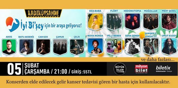 Moğollar’dan Flört’e; Çelik’ten Umut Kuzey’e; Can Gox’tan Çamur’a; Hedonutopia'dan Sena Şener'e; Nova Norda’dan Eda Baba’ya; Ados’tan Batu Akdeniz’e; Mert Şenel’den Şanışer & Sokrat St ikilisine birbirinden farklı tür ve dönemin temsilcisi müzisyenler Kadıköy Sahne’de İyi Bi şey için buluşuyor. 5 Şubat akşamı gerçekleşecek yardım konserinin tüm geliri kanser tedavisi gören bir hasta için kullanılacak.